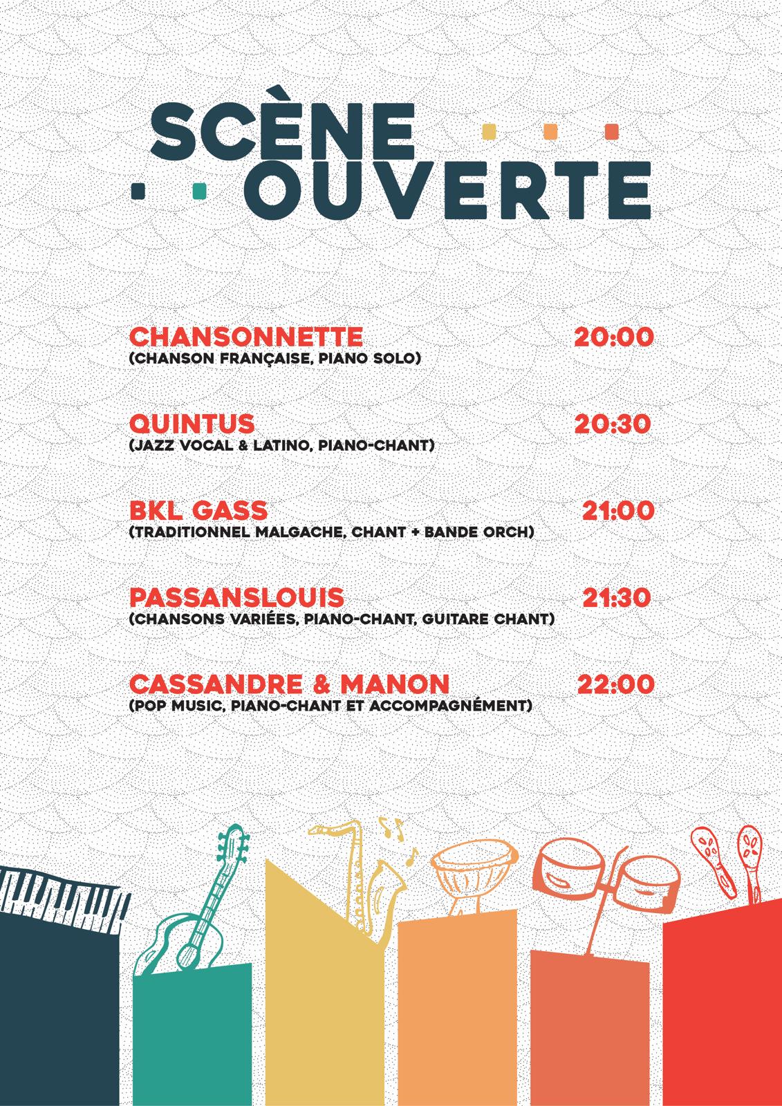(*) CHANSONNETTE : suite à l’indisponibilité de tous les participants du club pour cette scène ouverte du 21 juin, il sera proposé, pendant une demi-heure, la version piano-instrumentale solo d’une sélection de titres qui ont fait les beaux jours de notre club « Poussons la chansonnette » pendant un an, et qui vous évoqueront les grandes heures de la chanson française, ….voire vous inspireront ?